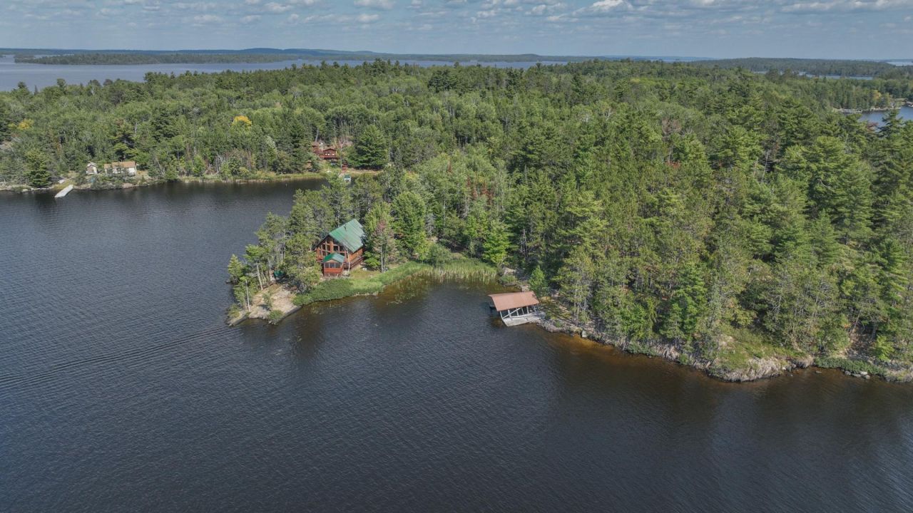 The finest sunsets over Rainy Lake can be viewed from this executive retreat's west facing, vaulted ceiling living room located on Grindstone Island! Sitting on over 2.5 acres with approximately 700' of shoreline this home is about a 4-minute boat ride to Voyageurs National Park. In addition to the 2 bedrooms there is a large loft that will sleep 6. Features include a rock fireplace, wrap around deck, gazebo and a cozy guest cabin that will sleep 4. This island get-a-way has electrical service and is about 1/4 mile northeast of Thunderbird Lodge that rents seasonal boat slips. The main cabin has approximately 1,548 finished sq ft and the guest cabin consists of 437 sq ft and has a 3/4 bath. Of course, the scenery is unbelievable and the fishing is top notch!!