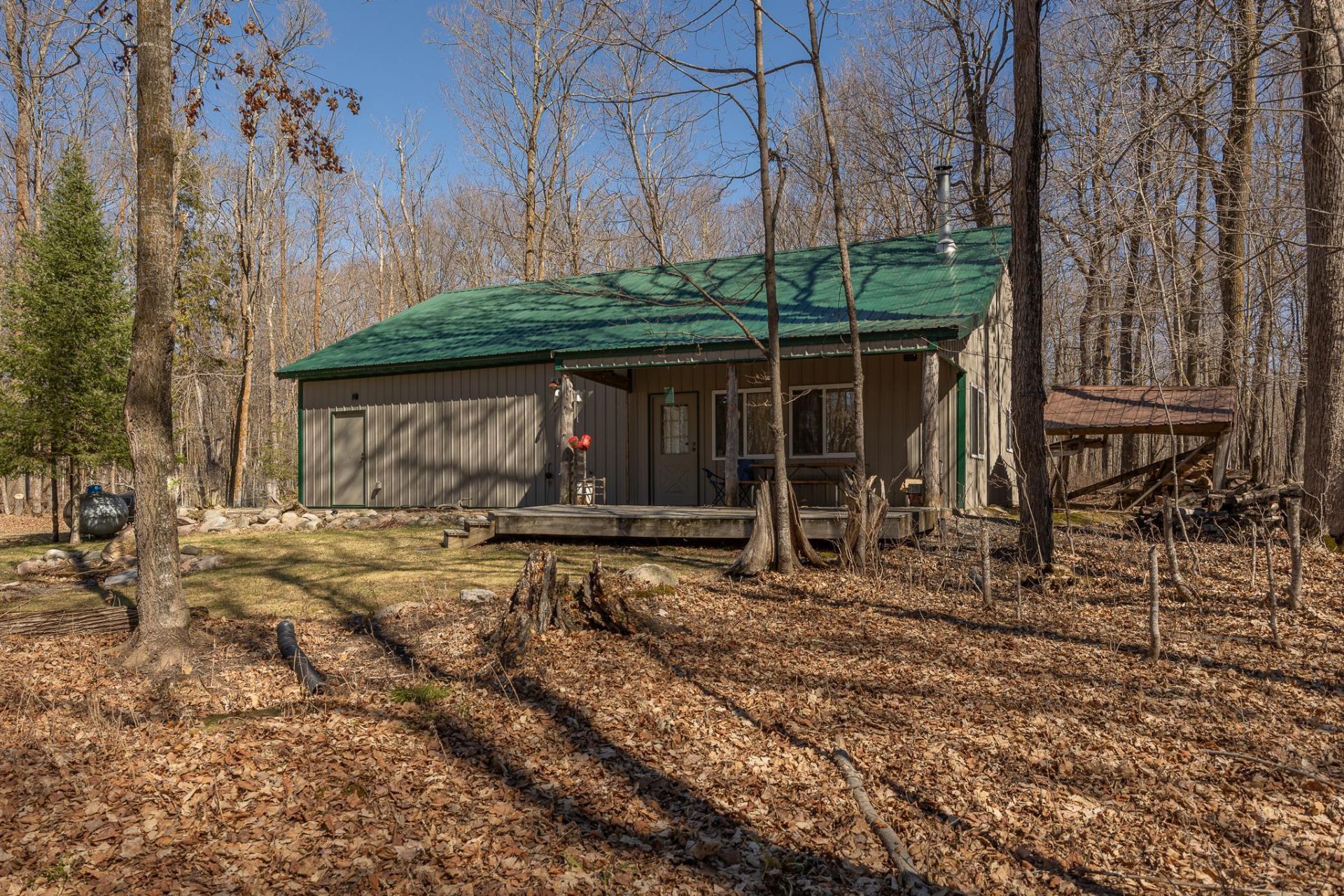 Set among towering pines and hardwoods on nearly 2.25 acres, this Boy Lake property offers a setting that feels quietly removed, yet deeply connected to one of the area's most sought-after lakes. A circular drive welcomes you in, where the home's maintenance-free exterior, metal siding and roof, blends naturally into the wooded surroundings. This 1-bedroom, 1-bathroom property is a strong fit for those who value time outdoors. Whether it's early mornings on the lake, afternoons exploring the surrounding woods, or evenings around the fire, the setting lends itself to a simpler, more connected way to spend your time.Inside, the open living space is anchored by warm wood finishes, vaulted ceilings, and exposed beams that create an inviting, lodge-style feel. The kitchen offers abundant cabinetry, a center island with seating, and space for gathering, all flowing easily into the dining and living areas. A freestanding wood stove adds a natural focal point, while large windows bring in the surrounding woods. Details such as the live log accent rising from the half wall to the ceiling add a touch of character you don't often find. Step outside to a covered porch and adjoining deck, an ideal place to settle in after a day on the water. The yard opens to a dedicated firepit area, offering another place to gather beneath the trees.One of the standout features is the attached oversized garage, offering exceptional space for storing boats, ATVs, bikes, snowmobiles, and all the gear that comes with time spent up north. It's a practical extension of the property that makes coming and going easy in every season. A walk to the lake reveals one of the property's most unique features. The path winds through a stand of mature cedars, forming a beautiful canopy as you make your way along the boardwalk to the shoreline. With over 180 feet of frontage, the setting at the water's edge feels peaceful and private, with views across to a nearby island. While set back from the lake, the tradeoff is space, seclusion, and access to Boy Lake, which is known for its fishing and connection to the Boy River, eventually leading to Swift Lake and Leech Lake for extended exploration. A finished blue fish house sits nearby and can easily serve as a bunkhouse for additional guests. If you've been looking for a property that offers privacy, acreage, and access to a larger lake system, paired with the storage and functionality to support an active Northwoods lifestyle, this one is worth the walk.