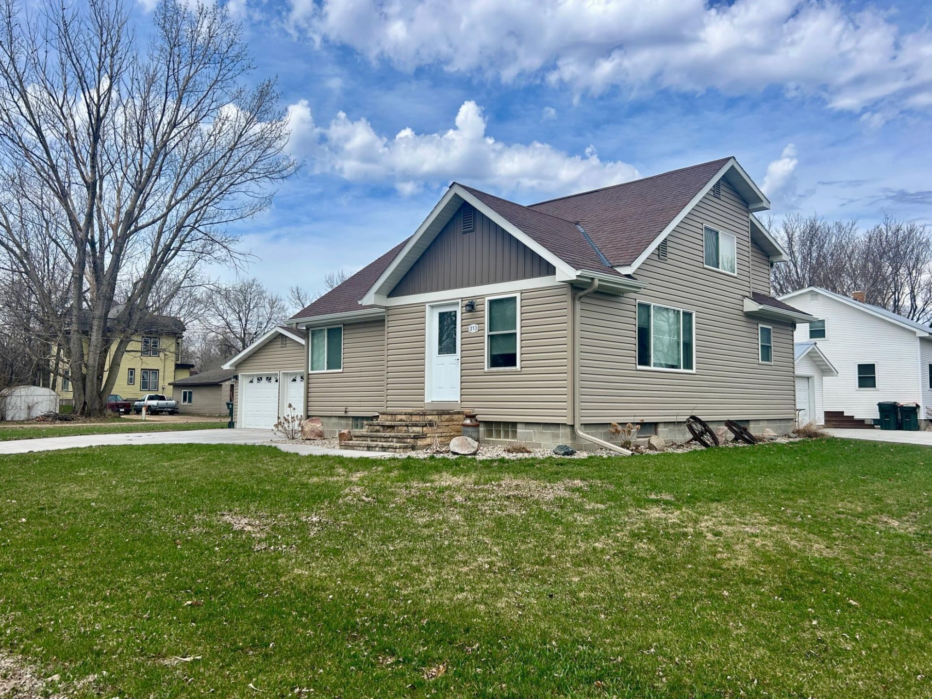 Experience the perfect blend of modern luxury and ultimate convenience in this fully remodeled 4-bedroom home! Situated on a spacious corner lot on the edge of town, this property offers a unique parkside lifestyle, located across the street from a city park. This home has been meticulously transformed from top to bottom, featuring a complete exterior refresh with new vinyl siding, windows, gutters, and professionally redone landscaping. The brand-new concrete driveway and sidewalks add curb appeal, while the corner lot provides easy alley access to the generous side yard. Once inside, you will enjoy a spacious living room centered around an eastern-facing picture window that floods the space with morning light. The beautiful new kitchen and dining area are designed for entertaining, featuring sleek finishes and a modern layout. The new LVP flooring throughout the main areas and plush new carpet in the bedroom are added bonuses. One of the main-level bedrooms has been thoughtfully converted to include the washer and dryer, providing the high-demand option for true one-level living. The property also features a heated breezeway that connects the main home to a fully finished and heated garage. With two bedrooms on the main level, two upstairs and an unfinished basement, this flexible floor plan is ready to grow with you.