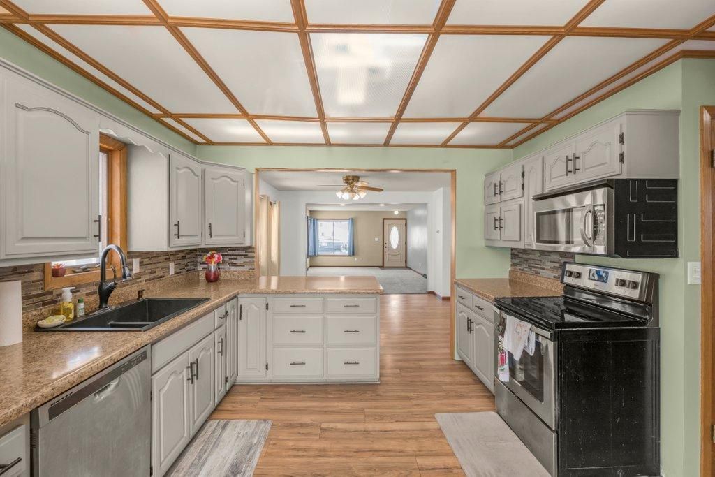Conveniently located just off Hwy 55, this well-maintained home offers easy main-floor living and a finished lower level with a spacious non-egress owner's suite. The updated kitchen with new countertops, ceiling tiles, and stainless-steel appliances, plus numerous major upgrades including A/C, furnace, flooring, and bathroom updates. Natural wood finishes throughout the property. A tandem detached garage provides exceptional storage and parking, with an additional storage garage out back. Walking distance to local schools and only half a mile from the hospital?this home combines solid bones with modern improvements.