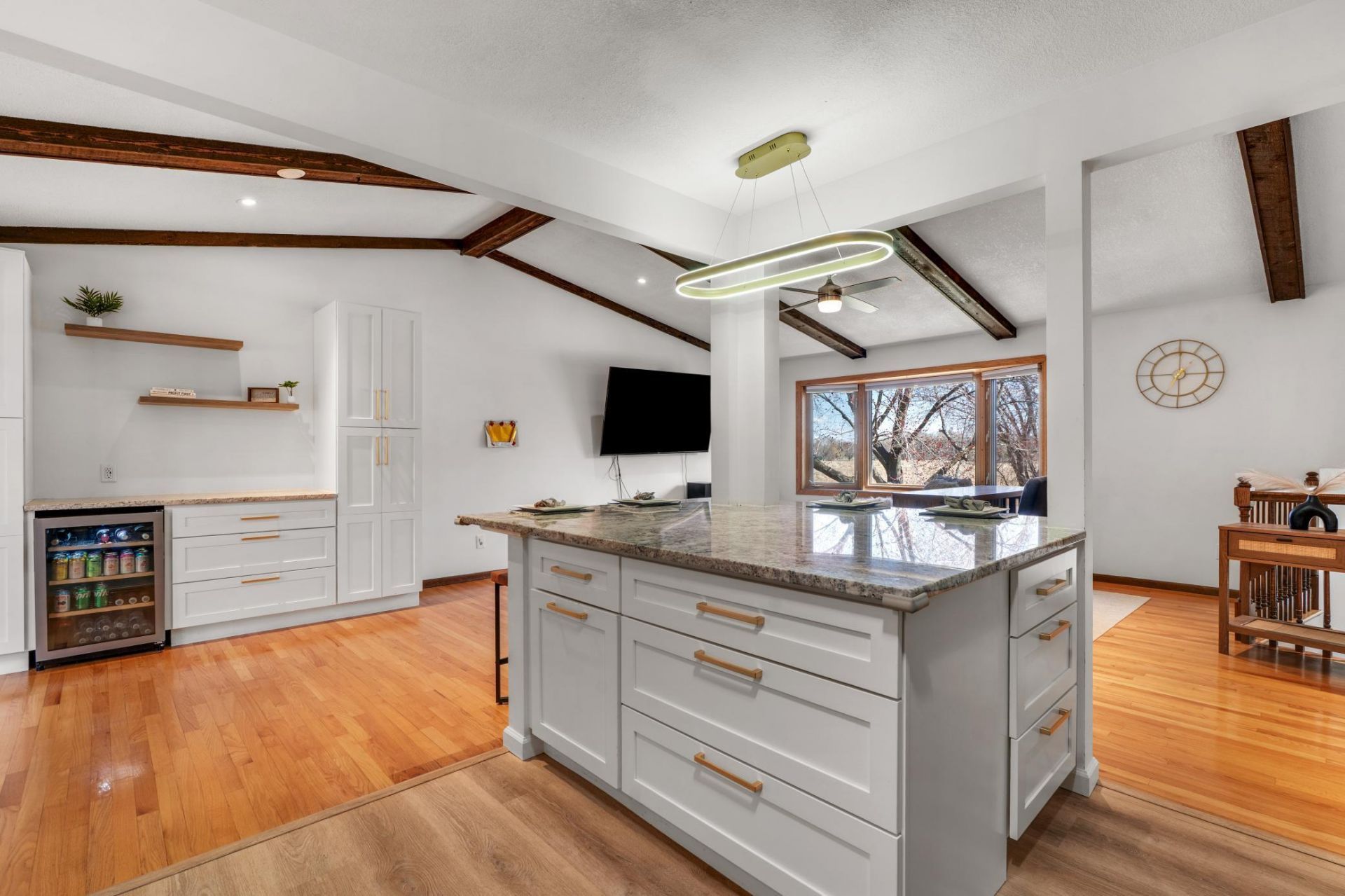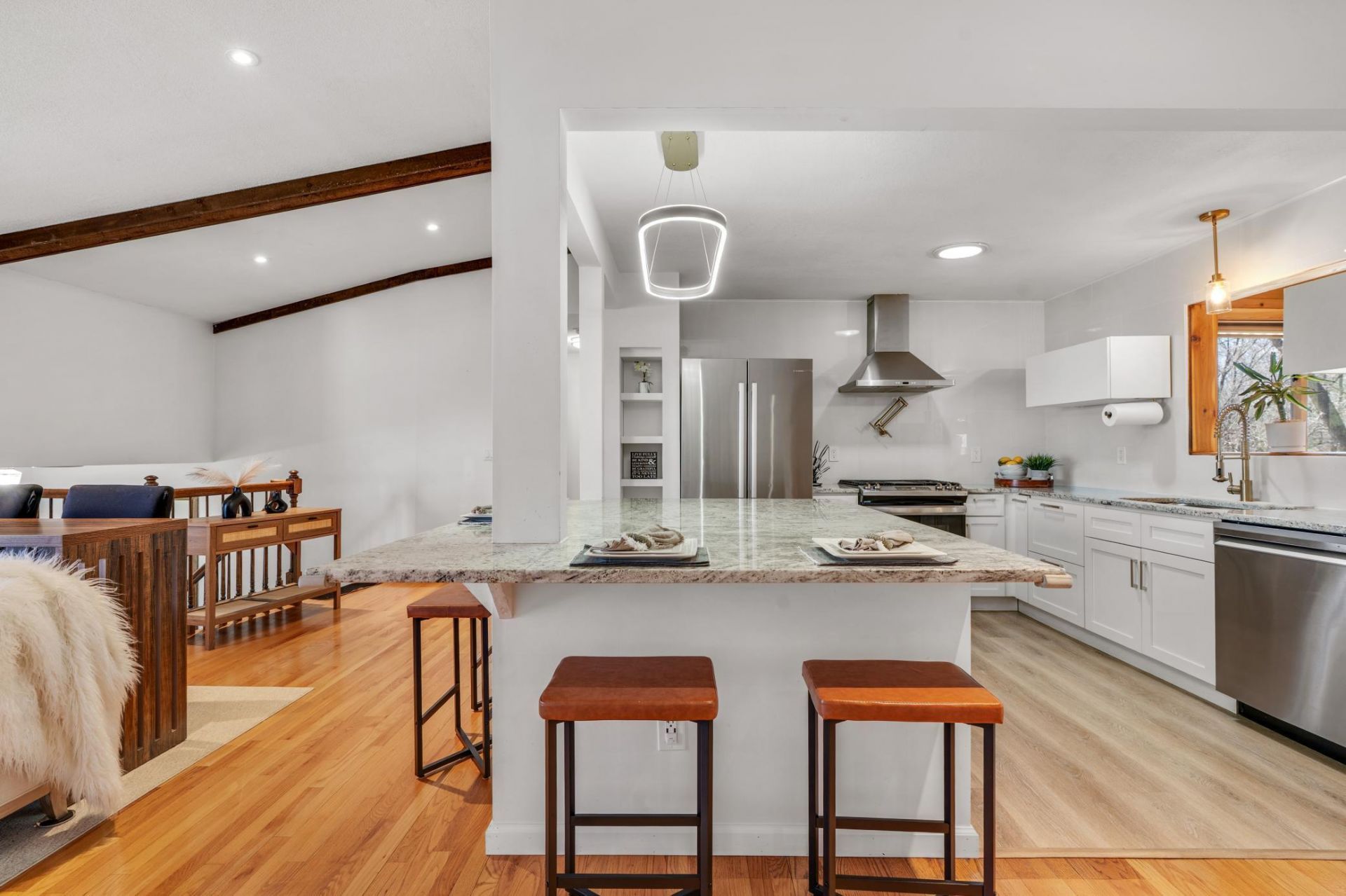 Welcome to this beautifully updated home tucked at the end of a quiet cul-de-sac, offering privacy, nature views, and thoughtful upgrades throughout. Situated across from serene wetlands, you'll enjoy peaceful surroundings year-round.Inside, the bright and inviting layout features hardwood floors, vaulted ceilings, skylights, and solar tubes that fill the home with natural light. The standout fully renovated kitchen boasts new soft-close cabinetry, stylish lighting, an oversized island, and updated appliances,including a beverage fridge, plus added conveniences like a pot-filler and in-sink macerator.The four-season sunroom with fireplace provides a cozy retreat and opens to a large deck, perfect for entertaining, relaxing, or enjoying the spacious backyard.This home offers 4 bedrooms and 2 bathrooms, with a versatile lower level featuring new carpet, an updated bathroom vanity, and a generous family room with bar area, ideal for gatherings and game nights.Recent updates include new gutters, A/C, water heater, water softener, lighting, ceiling fans, and a backyard shed for additional storage.Located in the highly desirable Mounds View School District, this move-in ready home combines comfort, updates, and a beautiful natural setting.