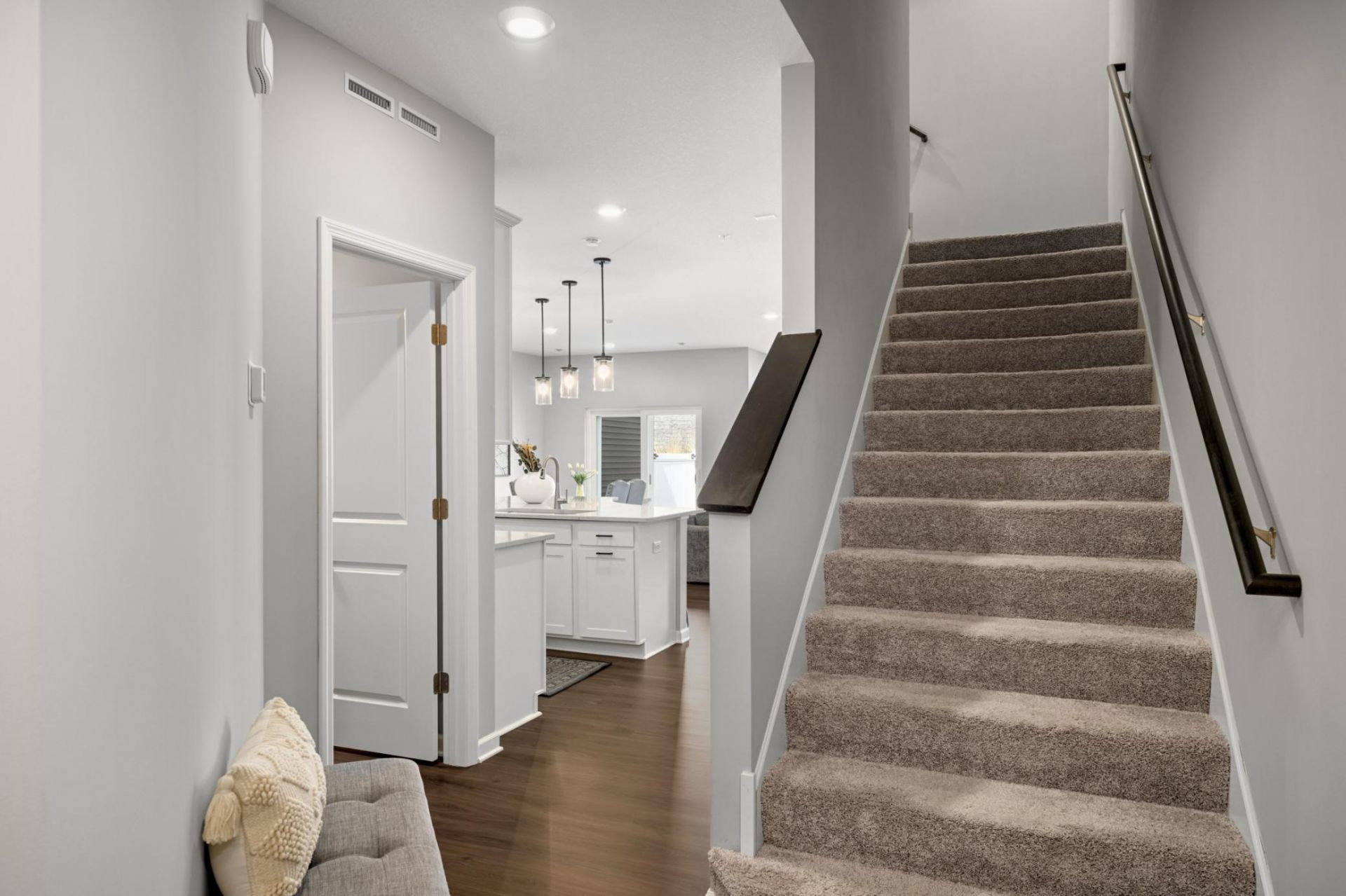 Welcome to this well-maintained, newer-construction open-concept townhome in Brooklyn Park's desirable Pemberly community, offering modern finishes, functional design, and low-maintenance living. Built in 2022, the main level features a welcoming entry with a nearby half bath, flowing into a bright living, dining, and kitchen area ideal for everyday living. The kitchen is anchored by an oversized center island and includes 42 cabinetry, granite and quartz countertops, stainless steel appliances, and a pantry closet. The dining area provides direct access to the patio for easy indoor-outdoor living. Upstairs, you'll find three bedrooms, a convenient laundry room, and a full bathroom with tiled floors, including a primary suite with a walk-in closet and private 3/4 bath with double vanity. Additional highlights include luxury vinyl flooring, a mudroom closet, ample storage throughout, and a 2-stall garage with overhead storage. Enjoy close proximity to shopping and dining at Arbor Lakes, along with nearby parks, trails, and outdoor recreation. Conveniently located near commuter routes, this home offers an ideal blend of comfort, functionality, and accessibility. Don't miss out!